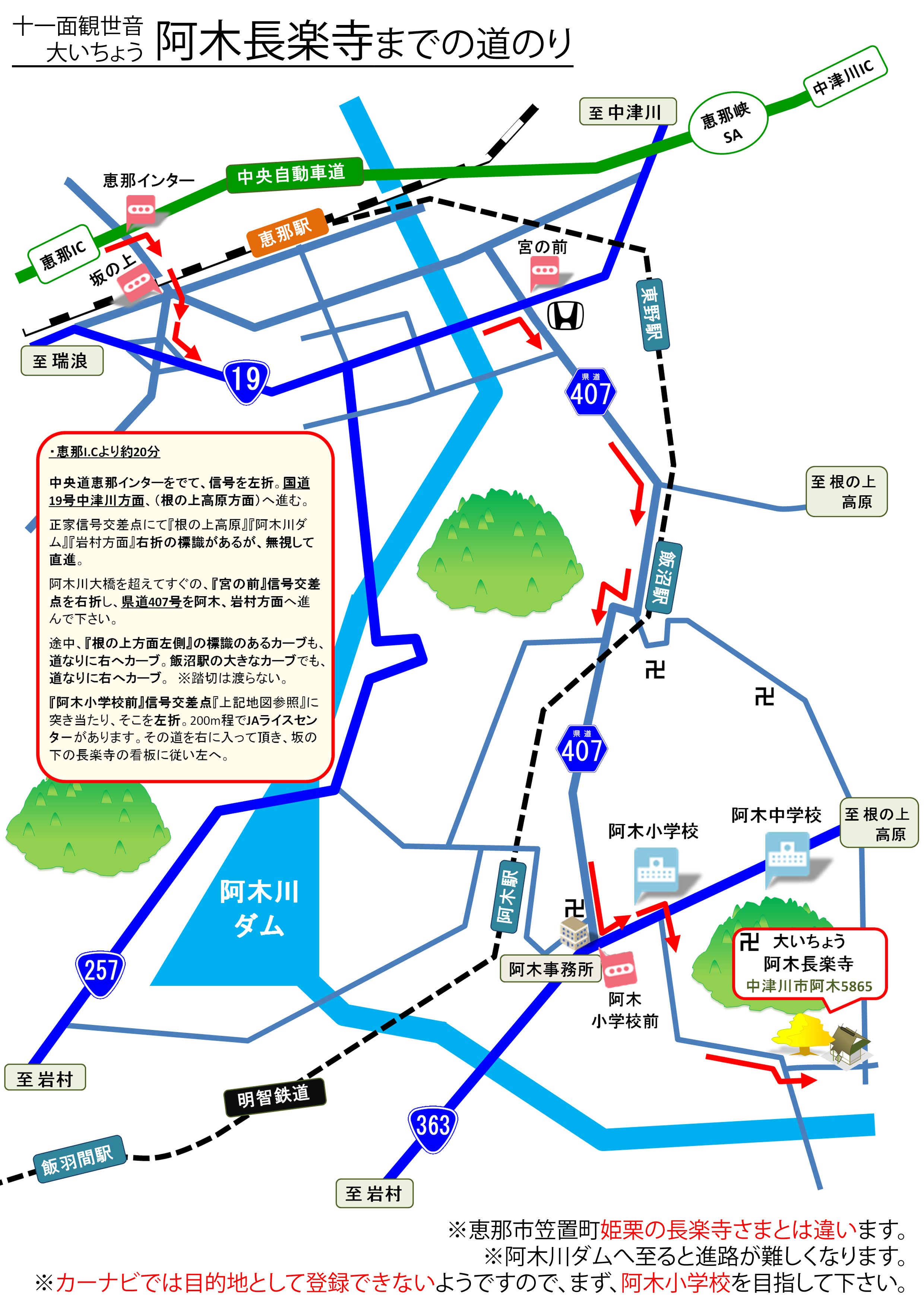 | ※カーナビでは目的地として登録できないようですので、まず、阿木小学校を目指して下さい。 |